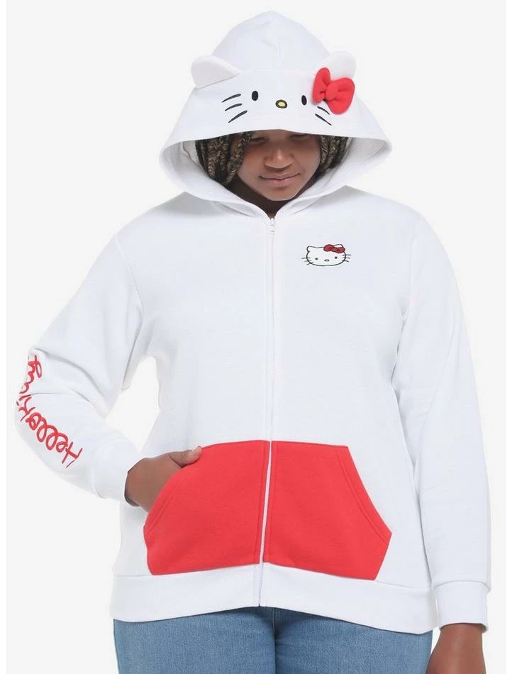 Wanna look just like your favorite Sanrio character? You can do that right meow with this adorable hoodie! Stay comfy and cute while reppin’ Hello Kitty with this zip-up hoodie, featuring an embroidered patch of Hello Kitty on the chest, her name embroidered on one sleeve and a hood that’s complete with her face, 3D ears and her signature red bow!