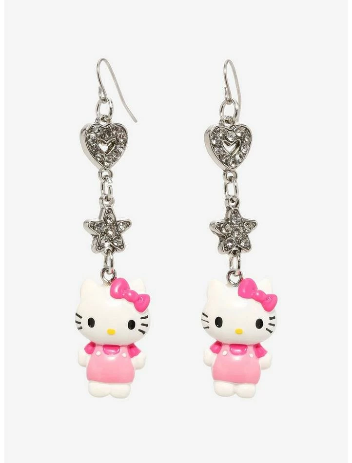 Add some bling to your jewelry collection with the help of Hello Kitty! She’s bringing some Sanrio and Y2K vibes to your look with these drop earrings, featuring 3D Hello Kitty drop charms, with bedazzled stars and heart charms up top.