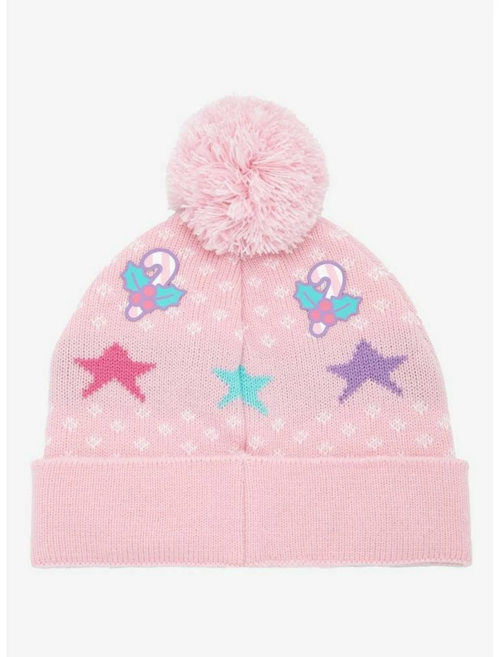 Keep your holiday outfits holly jolly with the help of Hello Kitty! She’s here to add some cute to your cozy Christmas look with this pastel pink pom beanie, featuring an allover design of stars and 3D fabric bows, complete with a patch of your fave Sanrio character on the fold and a fuzzy pink pompom up top.