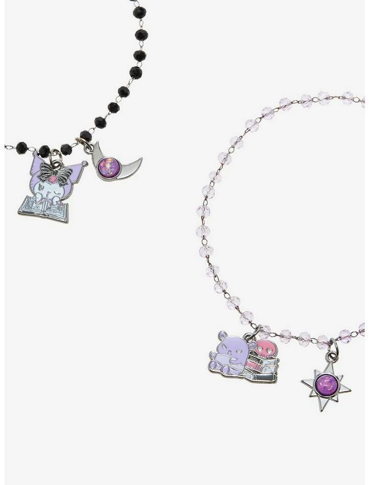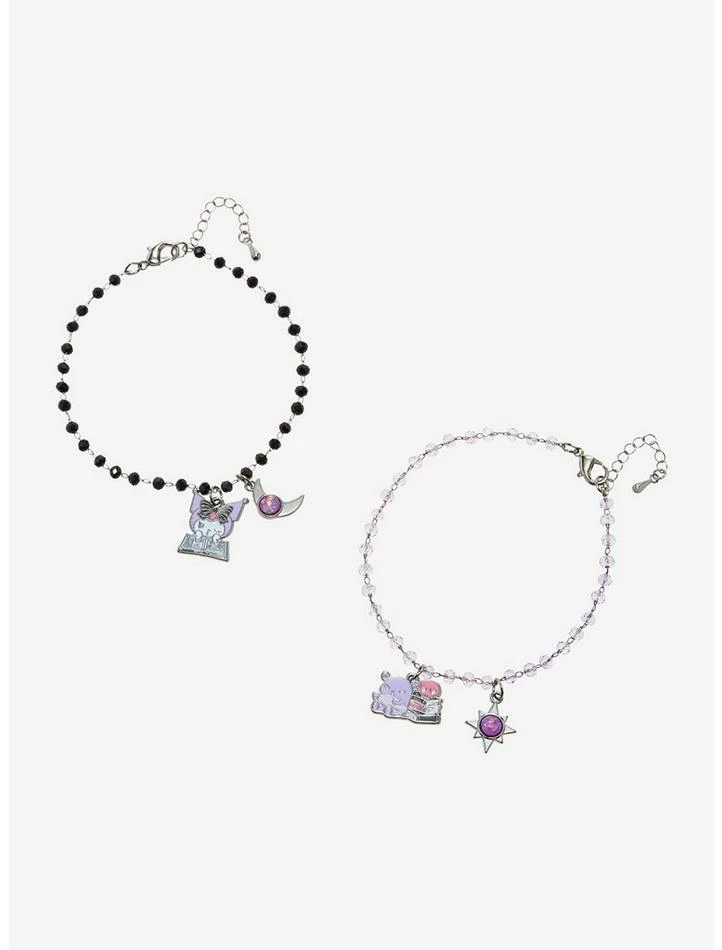 Besties, Kuromi and Baku are predicting this matching bracelet set in your future! Look as cute as your fave Sanrio duo with these matching bracelets, featuring a charm of Kuromi reading a fortune telling book on one and Baku sitting next to her books on the other. Both come with matching celestial charms with a purple gem center.