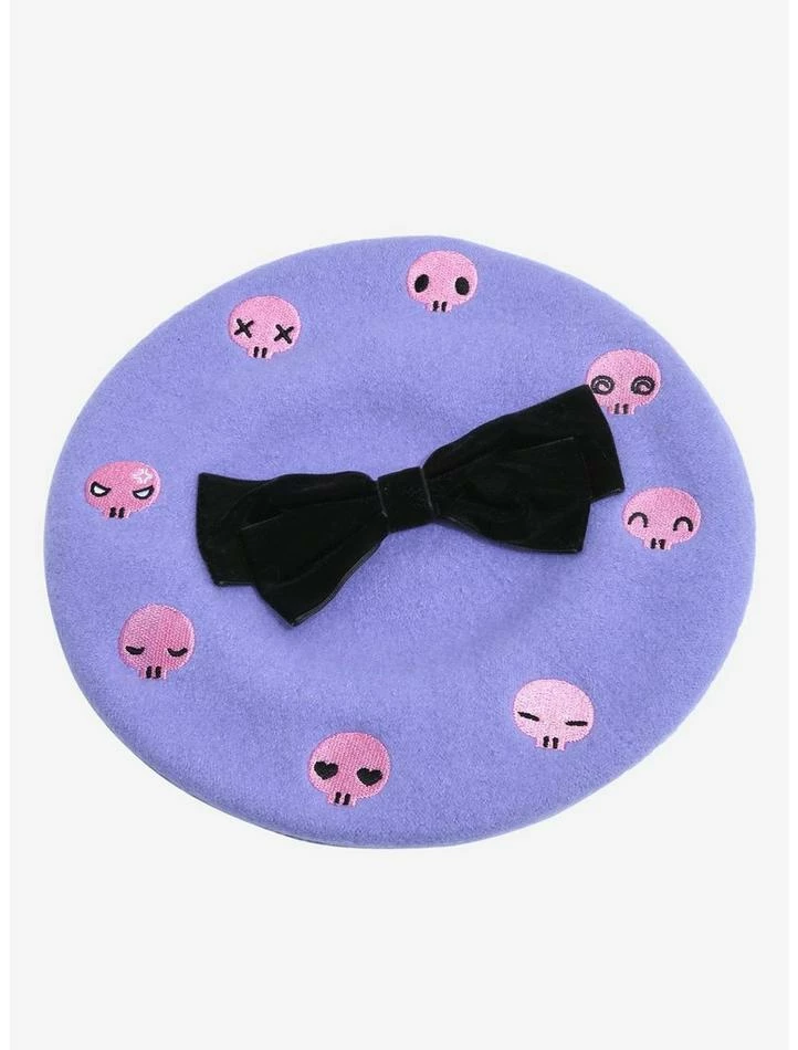 Follow Kuromi’s lead and add a cute hat to your ‘fit. This lavender beret will keep you looking both sweet and mischievous! It features an embroidered image of Kuromi on the front and embroidered pink skulls encircling the top, with a black velvet bow in the center.