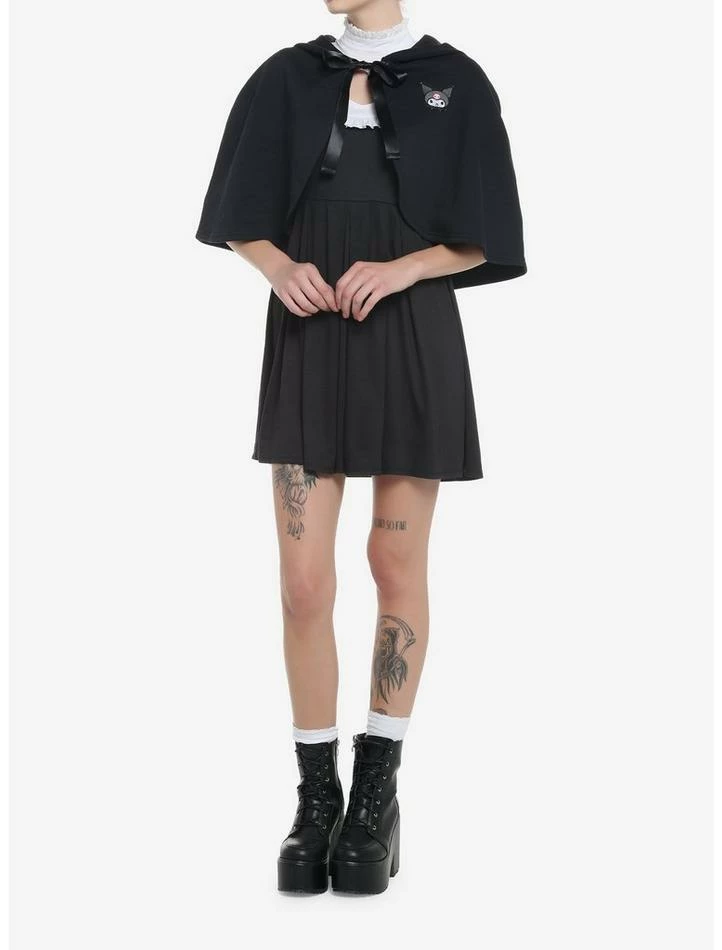Going for a devilishly cute look? Let Kuromi help you out with this adorable capelet! Featuring Kuromi’s face embroidered at the chest, a satin ribbon tie, and a hood featuring figural ears.