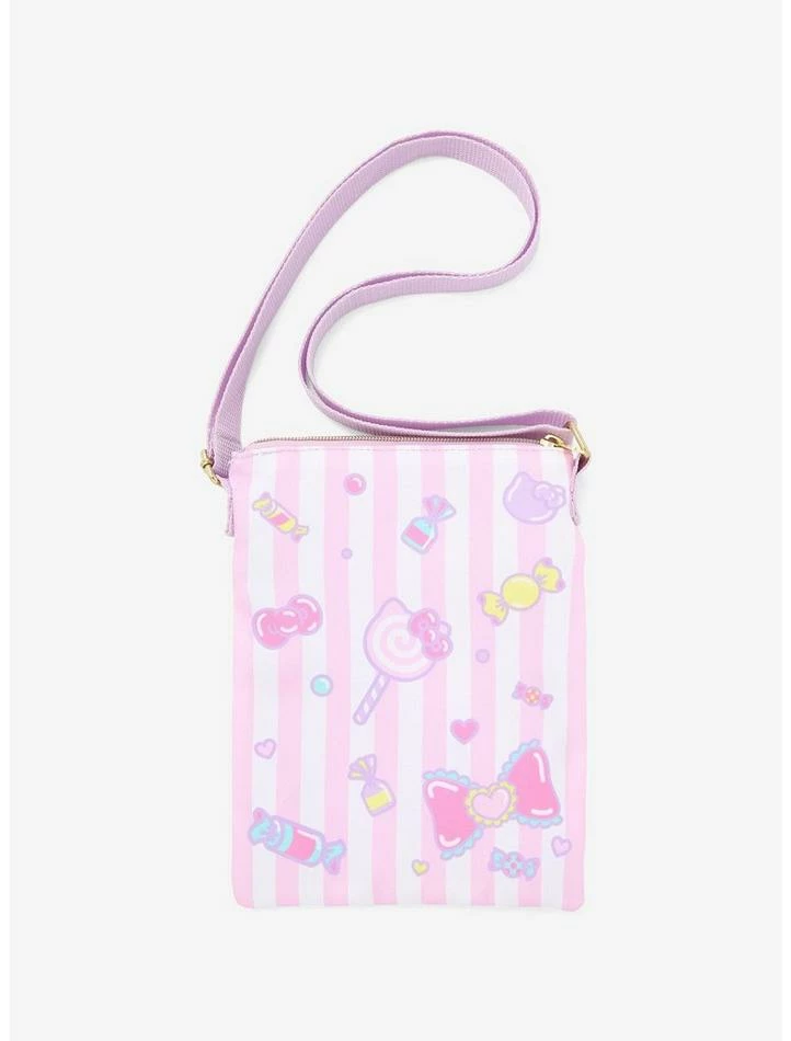 Carry all of your yummy sweets in this Hello Kitty passport crossbody bag! This pink and white striped bag features Hello Kitty dressed as a kawaii monster, holding onto a lollipop, and has tasty candy tossed all over. Adjustable strap, front zipper pocket, gold-tone hardware and top zipper closure.